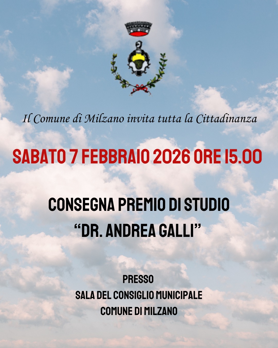 Il Comune di Milzano invita tutta la Cittadinanza SABATO 7 FEBBRAIO ALLE ORE 15.00 per la consegna premio di studio "Dr. Andrea Galli" presso la Sala del Consiglio.